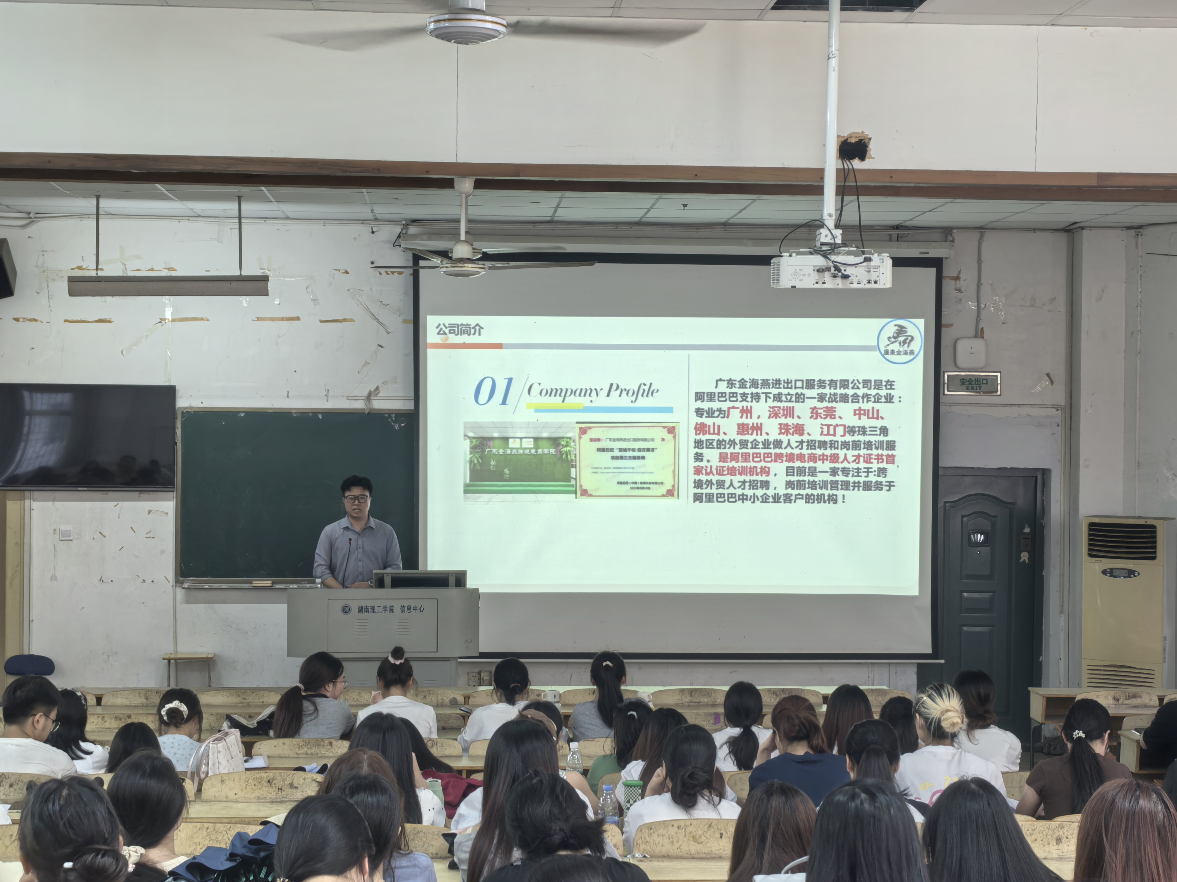 宣讲会上,卢老师结合行业实际从三个方面展开,一是详细解读了英语、电子商务专业在外贸领域的发展前景,明确职业成长方向;二是客观分析了初入行业可能面临的业务难点与适应挑战,提供实用应对思路;三是举例讲解地域经济发展特点与外贸扶持政策,帮助学生把握行业机遇。卢老师还详细展示往届外贸学子的就业案例、公司外贸服务体系等,向与会同学传达了招聘信息。