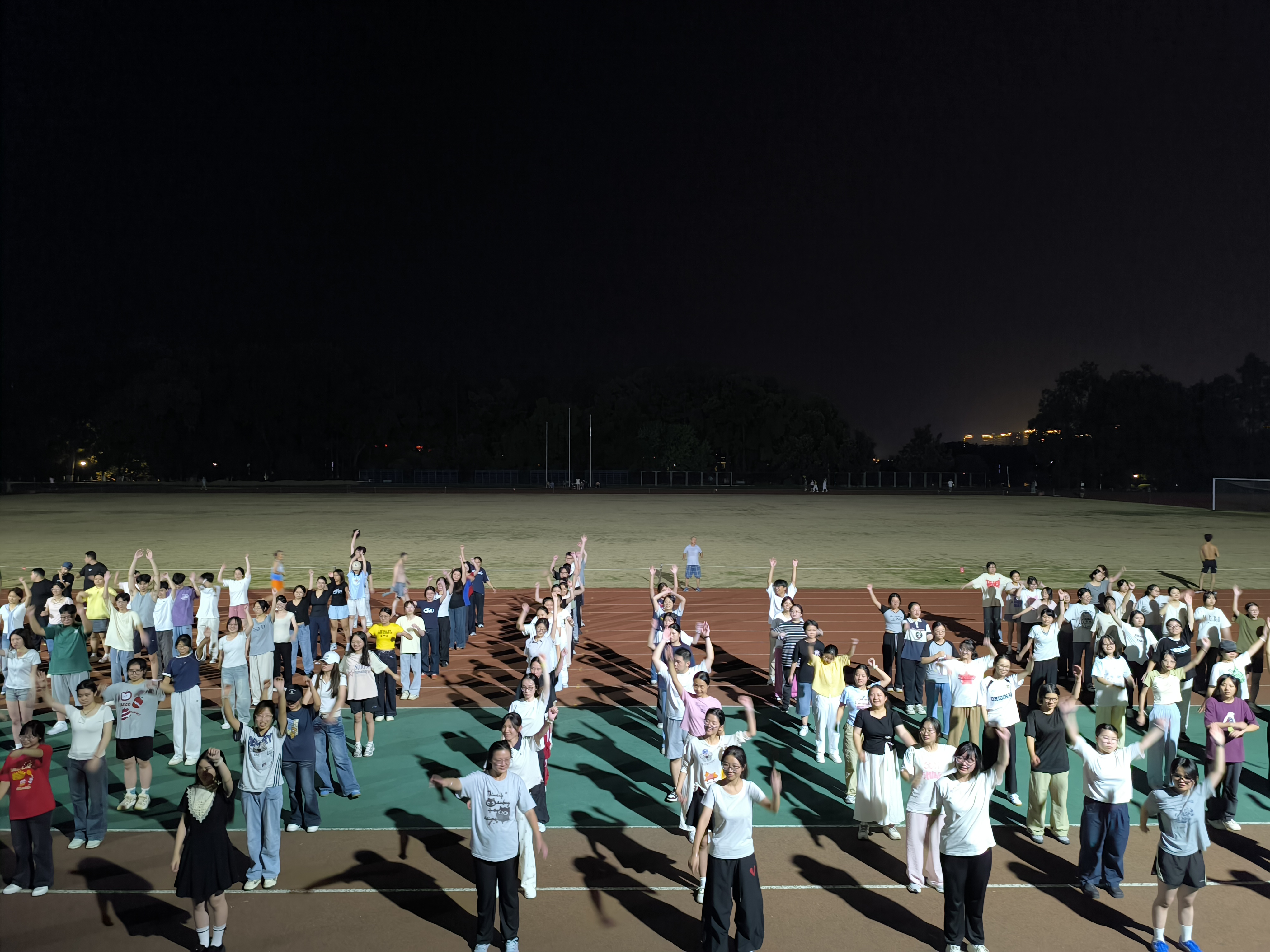 随后,在专业志愿者的带领下,全体师生开展了系统性热身运动——从关节活动、动态拉伸到原地高抬腿,每一个动作都认真到位,为接下来的夜跑做好充分准备,有效降低运动损伤风险。晚7时30分,随着动感十足的音乐响起,夜跑正式开始。童耀南院长率先领跑,步伐稳健有力;刘青姗书记、余航远老师、蒋鑫老师紧随其后,不时与身边的学生交流互动;学生们排成两列、互相鼓劲,或跟着节奏调整呼吸,田径场上的脚步声、笑声与音乐声交织在一起,成为秋夜校园里最鲜活、最动人的画面。